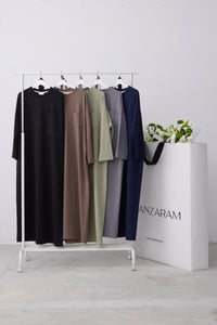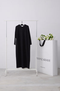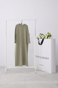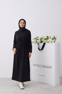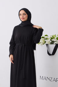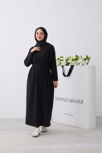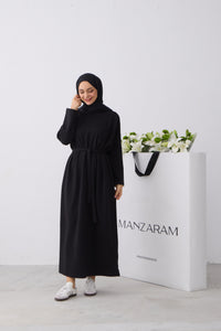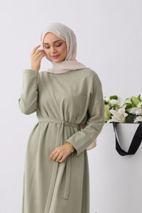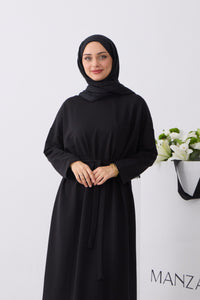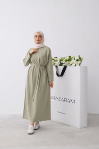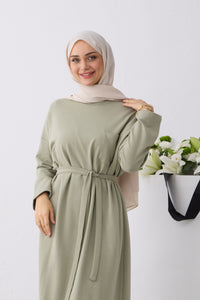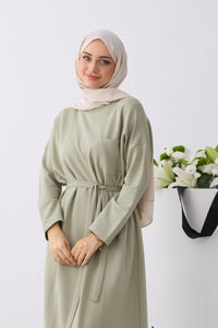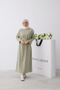 Rechtvallende jurk met ronde hals en lange raglanmouwen. De jurk is afgewerkt met een strikceintuur in de taille en een labeldetail op de mouw.
