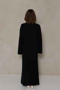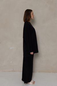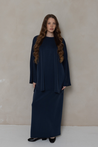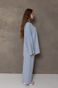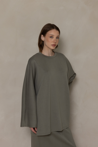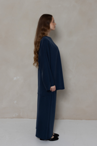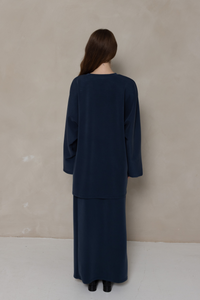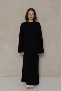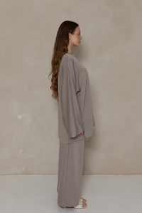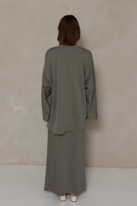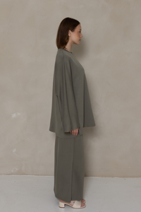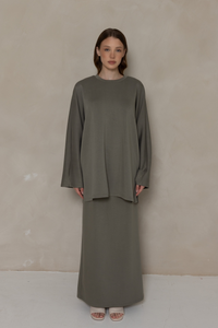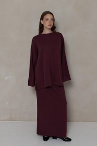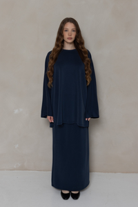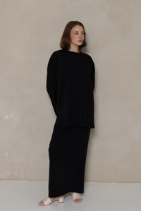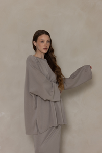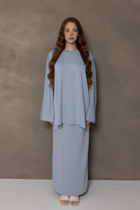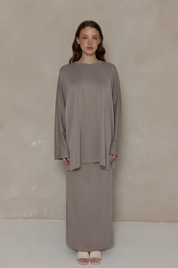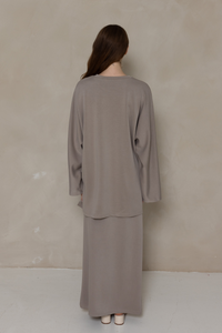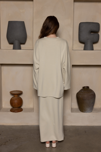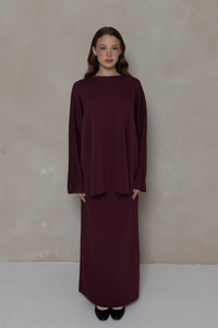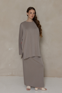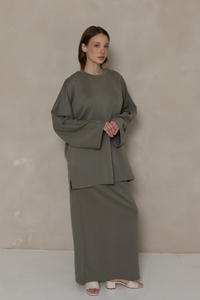 Deze set bestaat uit een losvallende top met ronde hals en rechte mouwen, gecombineerd met een rechte, enkellange rok. De soepele stof en ruime pasvorm zorgen voor optimaal draagcomfort. Ideaal voor dagelijks gebruik of als comfortabele loungewear.